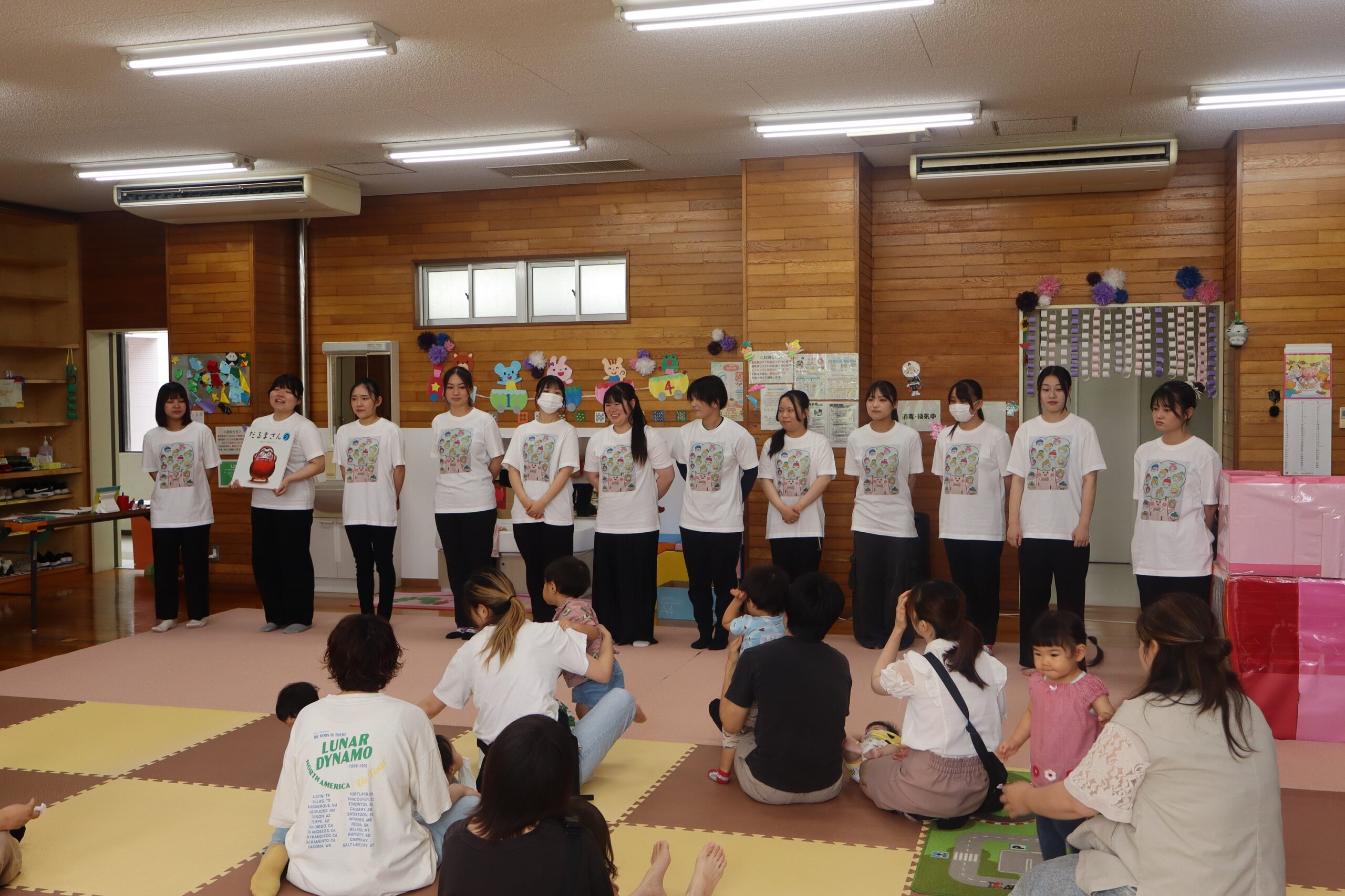 大学内に施設を招致したことで、学生たちは、日々学んだことを直ぐに実践することができ、学修成果を高めています。2025年度も、幼児教育・保育科の各ゼミが様々なイベントを展開しています。7月2日(水)に行われた「学生さんとあそぼう」では、たくさんの子どもたちに、音楽遊びを楽しんでもらいました。