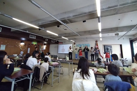 12月14日、地域の団体「手話っち」のクリスマス会に参加しました。本学手話部は四年前にこの催しにお招き頂いて以来、四年連続の参加となりました。昨年より企画にも携わらせていただき、手話っちメンバーや山形西高校の皆さんと協力し、山形聾学校や村山特別支援学校の子どもたちや保護者様、先生方を招待するという形で行いました。当日は紙芝居や歌、ジェスチャーゲーム、ポンポンカーリング等で楽しい時間を過ごすことができました。