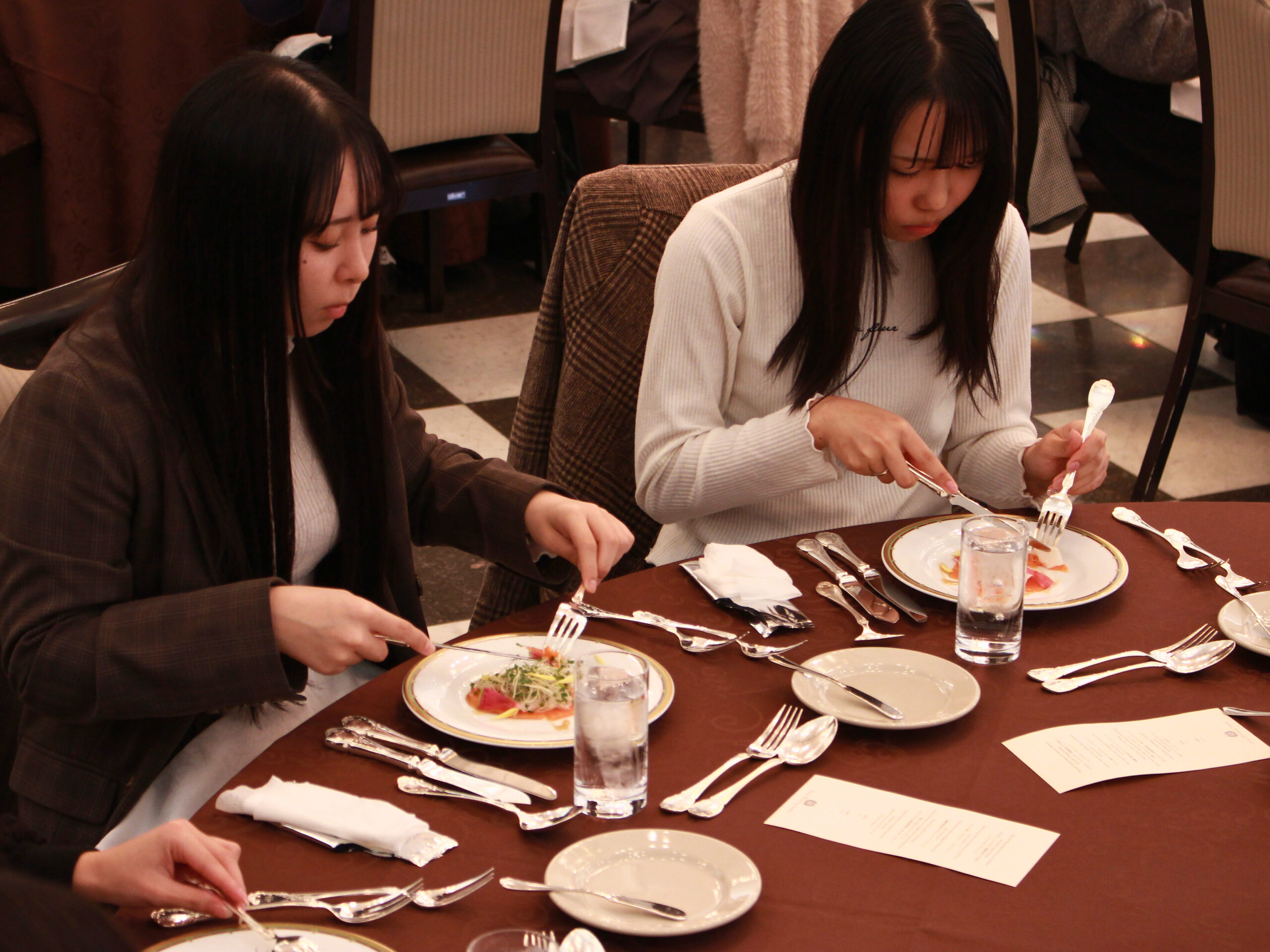講座では、フルコース料理をいただきながら、ナイフやフォークの使い方、食事中や離席時のマナーなど、フォーマルな場で求められる立ち居振る舞いを実践的に学びました。