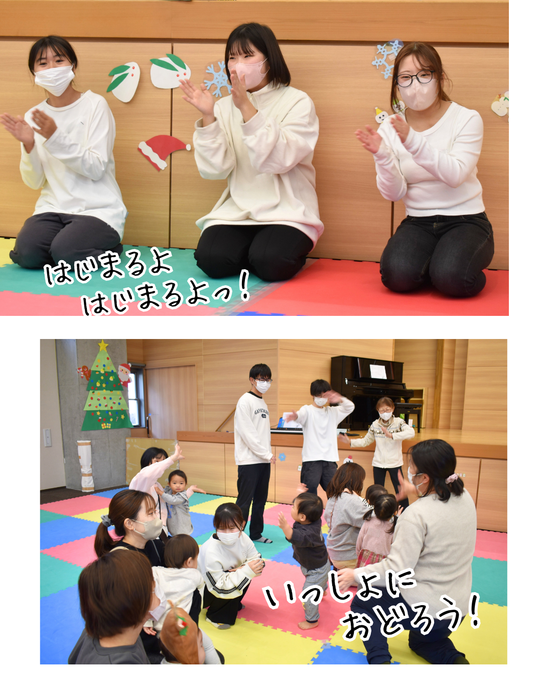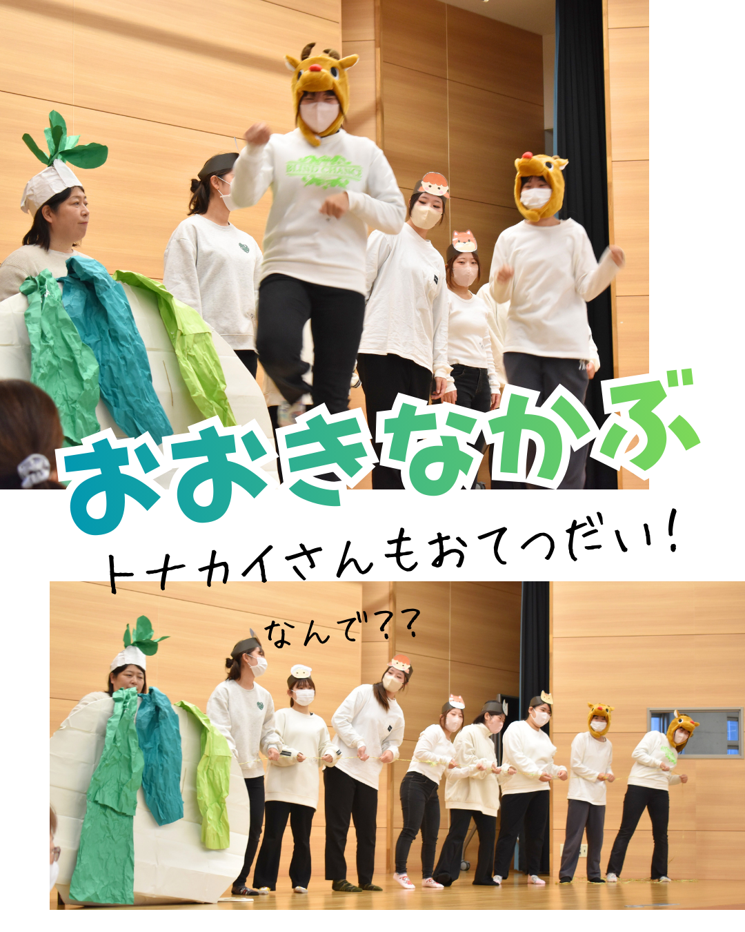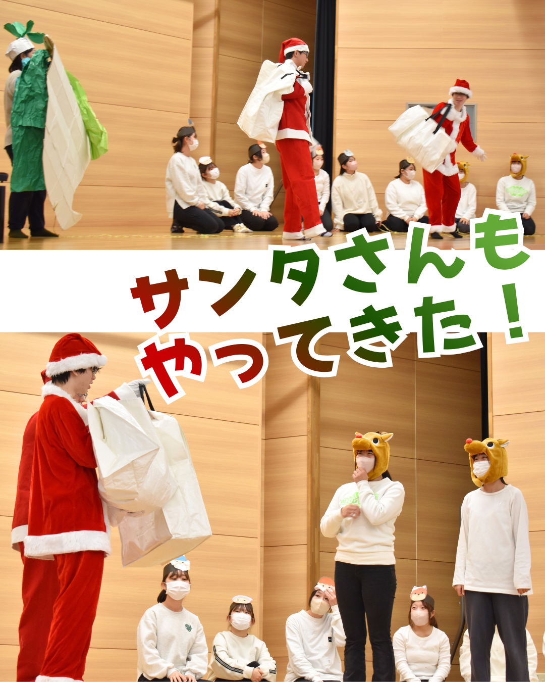 ハンドベル🔔の優しい音色や、クリスマスの絵本📖の読み聞かせ、そして「おおきなかぶ」の劇にはなんと、トナカイに扮した学生が登場して、一緒に「うんとこしょ、どっこいしょ」。