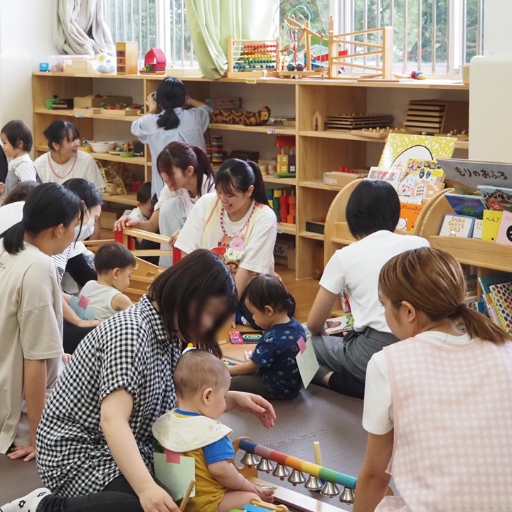 夏休み期間中のため、久しぶりの開催となりましたが、たくさんの親子にご参加いただき大盛況となりました。学生たちの手あそび歌に合わせて、体を動かしたり模擬保育室のおもちゃで楽しく遊んでいただきました。
