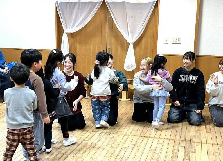 1月8日(木)、子ども学科正課外活動「伝承あそび」に参加している1年生、2年生が、付属幼稚園の年中児とともにわらべうた遊びを楽しみました。2年生の交代制リーダーを中心にプログラムを組み、実践を重ねたこの活動も今年度は今回が最終回。その様子を学生達の感想や写真とともに紹介します。