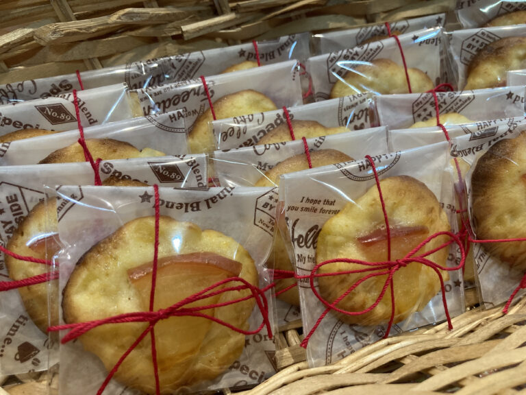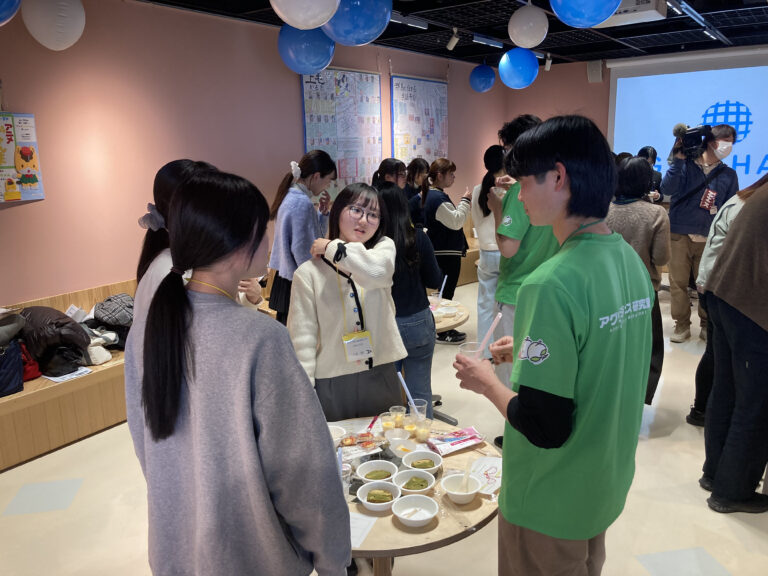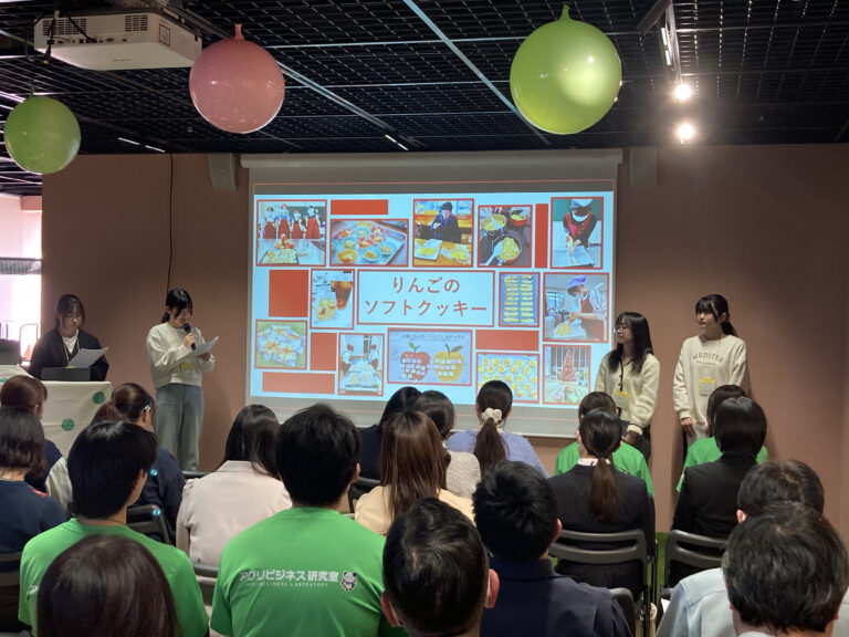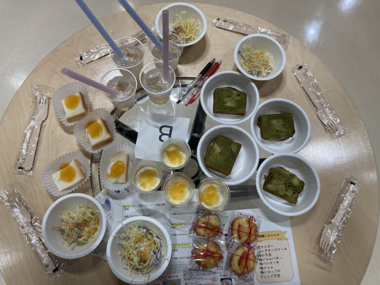 活動報告の後には試食会も行われ、梅を使用したお菓子やドレッシング、りんごのパウンドケーキなどが提供されました。本学からは学生が開発・提案した「りんごのソフトクッキー」を試食していただき、冷凍保存ができる点などが好評で、多くの参加者から関心が寄せられました。