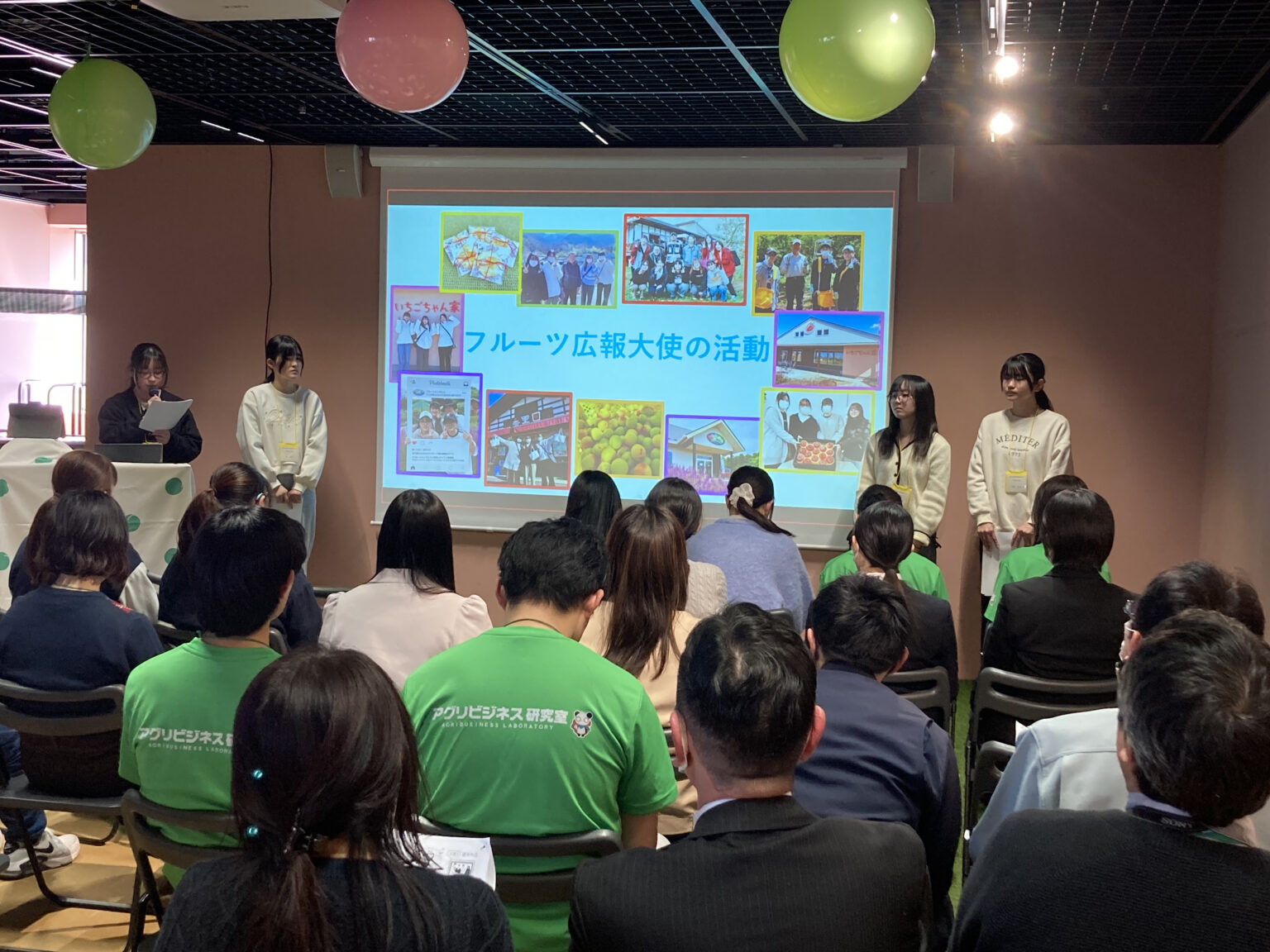 本学からは「フルーツ広報大使」に任命された学生たちが参加し、県産フルーツの認知度向上や消費拡大に向けたPR活動の成果を発表しました。学生たちは、SNSやポスター、試食イベントなどを通じて、果物の魅力を発信してきました。