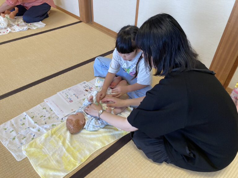 当日は、年長から小学校2年生までの親子6組14名が参加し、赤ちゃん人形を使ったおむつ替えや着替え、寝かしつけなどのお世話体験のほか、手遊びや絵本の読み聞かせなど、盛りだくさんのプログラムを楽しみました。