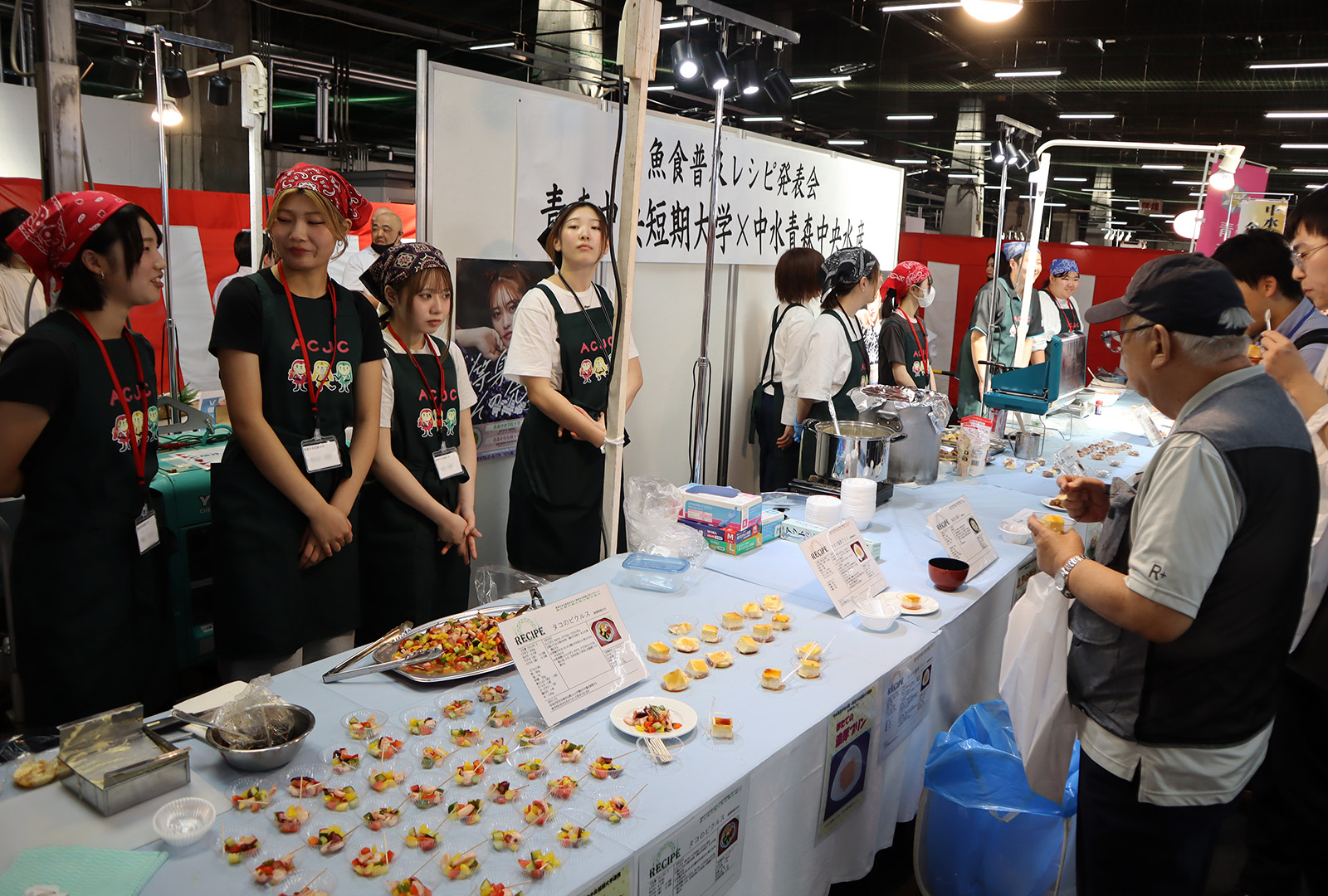 青森中央水産株式会社で2025年9月12日に開催された「2025年度青森中央水産株式会社年末商品展示会」において、本学食物栄養学科の学生が開発した「魚食普及レシピ」の発表会を行いました。