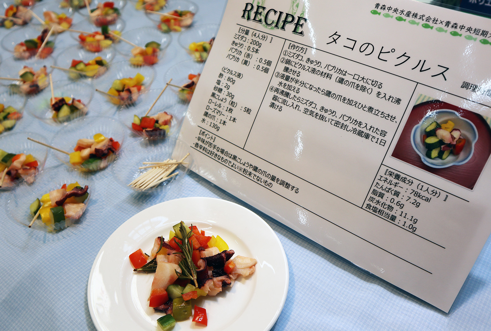 本学では、今年度より青森中央水産株式会社と連携して「魚食普及レシピ」を研究開発しています。生活様式の変化や食文化の多様化などによる魚離れが進む中、将来の担い手となる若年層への魚食普及を目的としたレシピや調理方法を研究し、開発しました。
