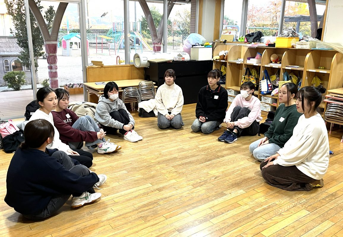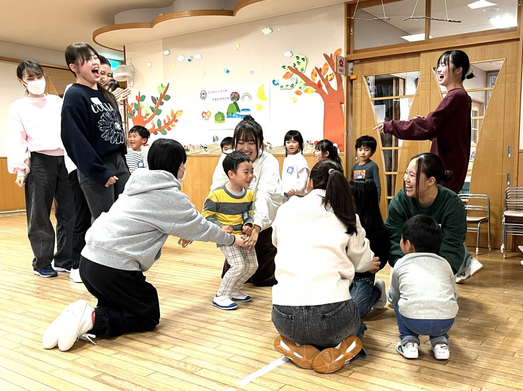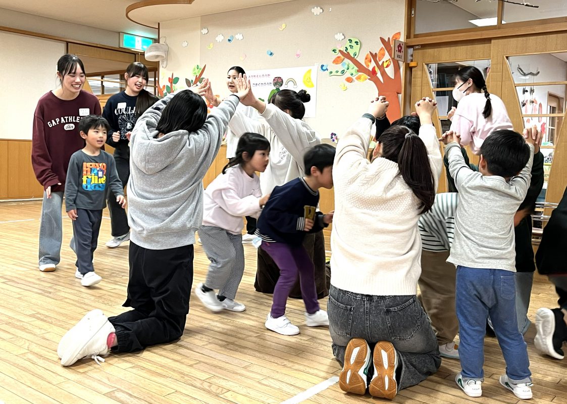 11 月6日(木)子ども学科正課外活動「伝承あそび」のメンバーの1年生、2年生が、付属幼稚園の年中児といっしょにわらべうた遊びを楽しみました。2 年生の交代制リーダーを中心にわらべうた遊びのプログラムを組み、実践した様子を、学生達の感想や写真とともに紹介します。